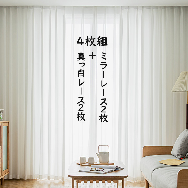 【4枚組】お部屋に合う 透けにくい シンプル おしゃれ 遮像 ミラーレース2枚+真っ白レース2枚 UVカット 2倍ヒダ