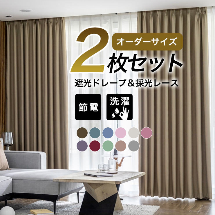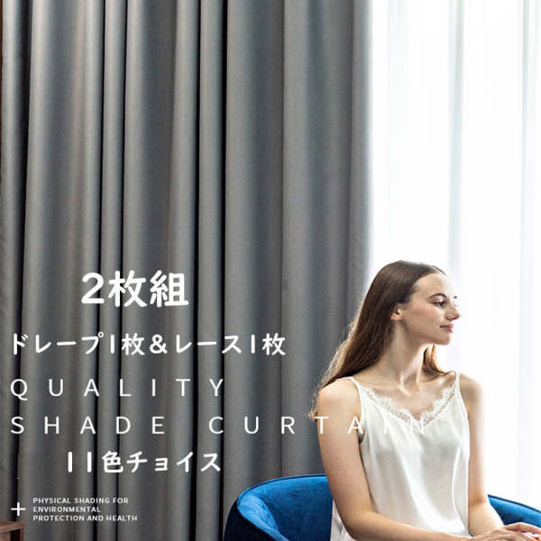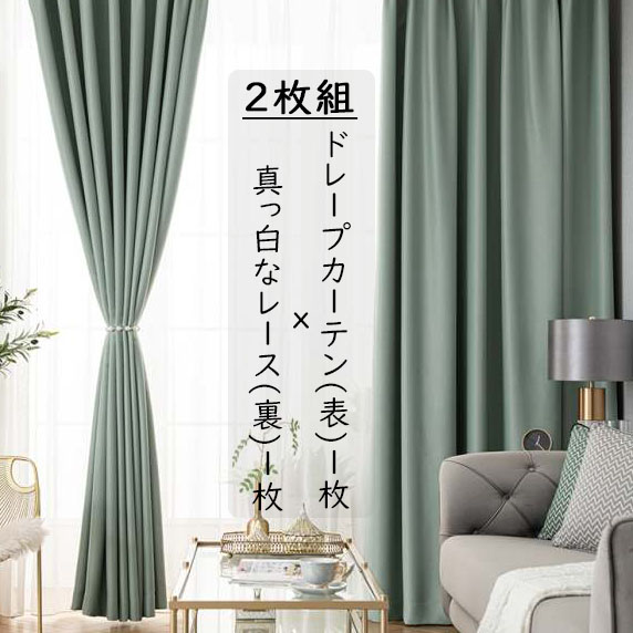 【2枚組】セット 11色 お手頃価格 高遮光率 無地ドレープ&白レース おしゃれ 遮光1級 断熱 カーテン 2倍ヒダ