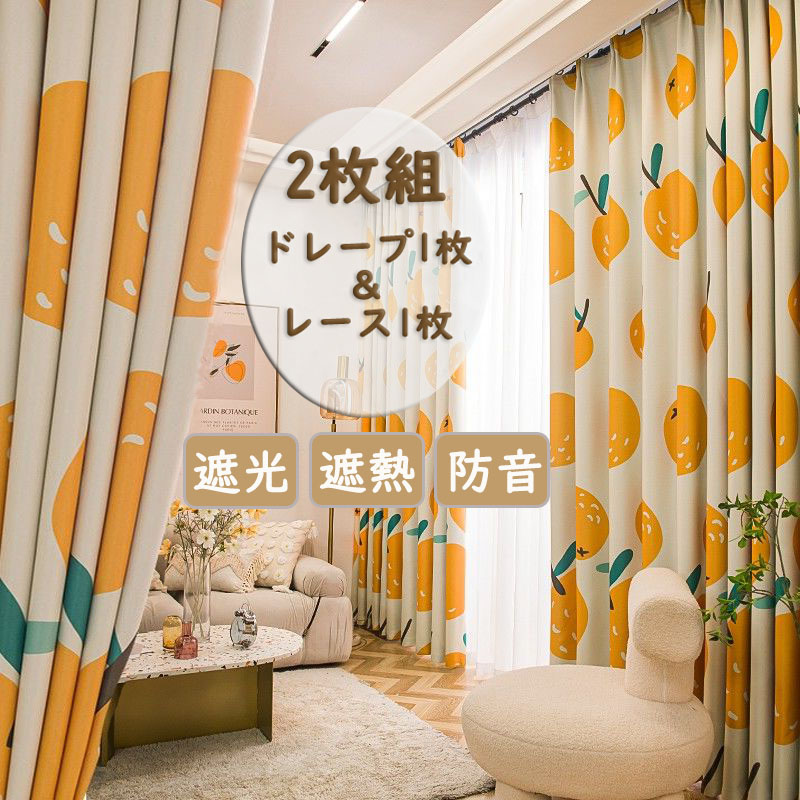 【2枚組】可愛いデザイン みかん柄 韓国系 乙女感 遮光 遮熱 防音 ドレープ+レース セットカーテン 2倍ヒダ