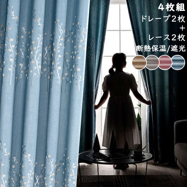 【4枚組】北欧風 おしゃれ 花柄 優しい雰囲気 繊細な刺繡 美しいデザイン 遮像 UVカット透け感 レースセットカーテン 2倍ヒダ