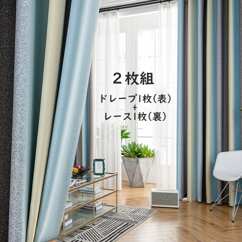 【2枚組】グラデーション ストライプ柄 4色展開 好感度UP 地中海風 全遮光カーテン ドレープ1枚+レース1枚 遮熱保温 防音カーテン おしゃれ カーテンセット 2倍ヒダ