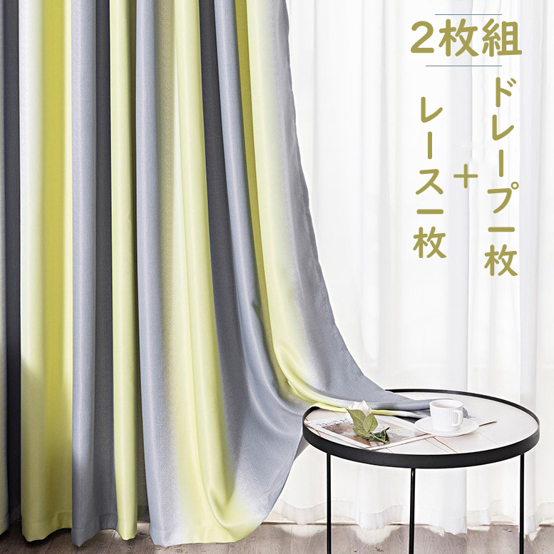 【2枚組】 西海岸 地中海風 可愛い おしゃれ カーテン セット グラデーション色 遮光2級 カーテンセット ドレープ1枚+レース1枚 2倍ヒダ