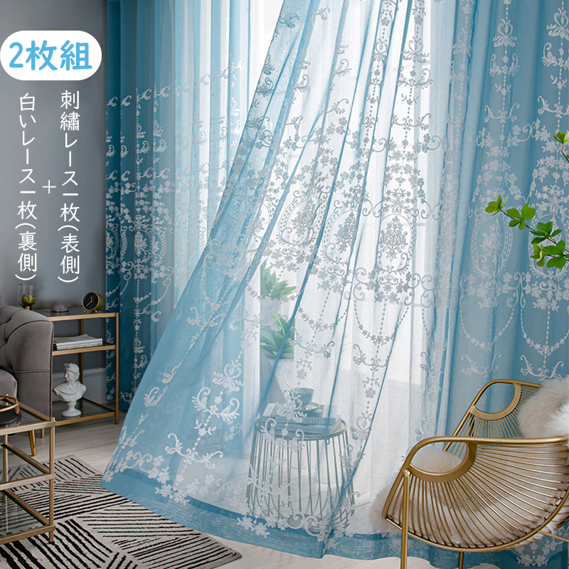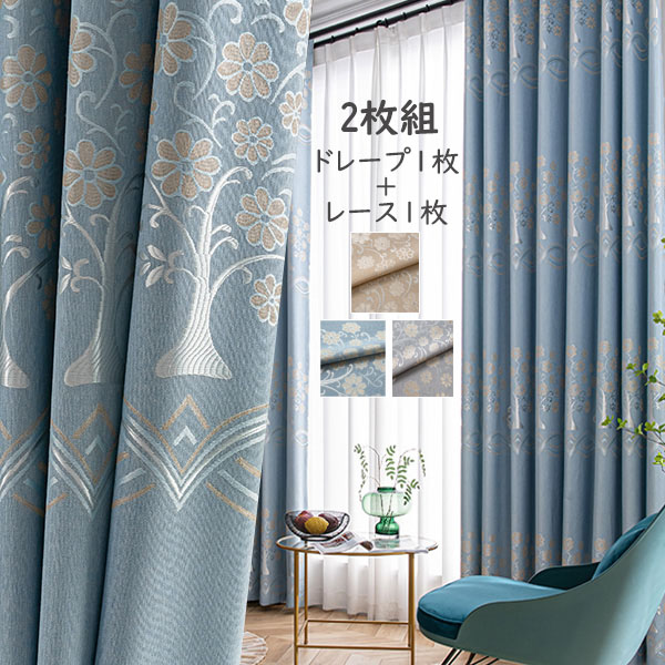 【2枚組】カーテン セット レース カーテン華やか 刺繡 エレガント フランス ロマンティック 遮像 目隠し 花粉防虫 UVカット 2倍ヒダ