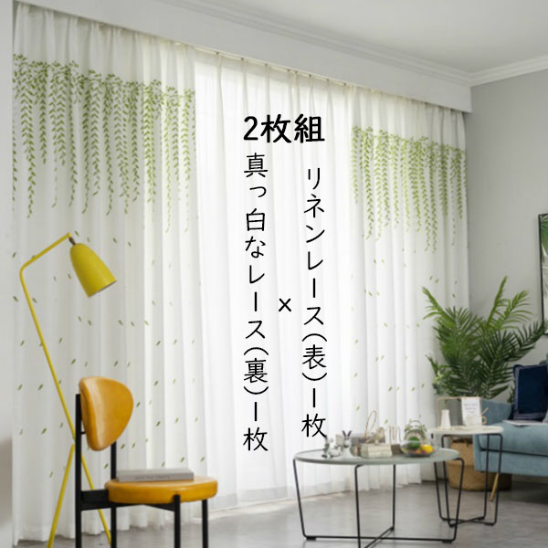【2枚組】おしゃれ 明るい 刺繍 リーフ 植物柄 夏 遮像 UVカット リネン+レース セットカーテン 2倍ヒダ