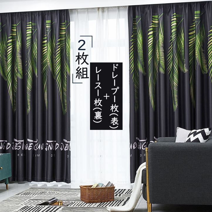 【2枚組】おしゃれなボタニカル柄 遮像 透けにくい プライバシー保護 ナチュラル カーテンセット リネン1枚&レース1枚 花粉防虫 2倍ヒダ