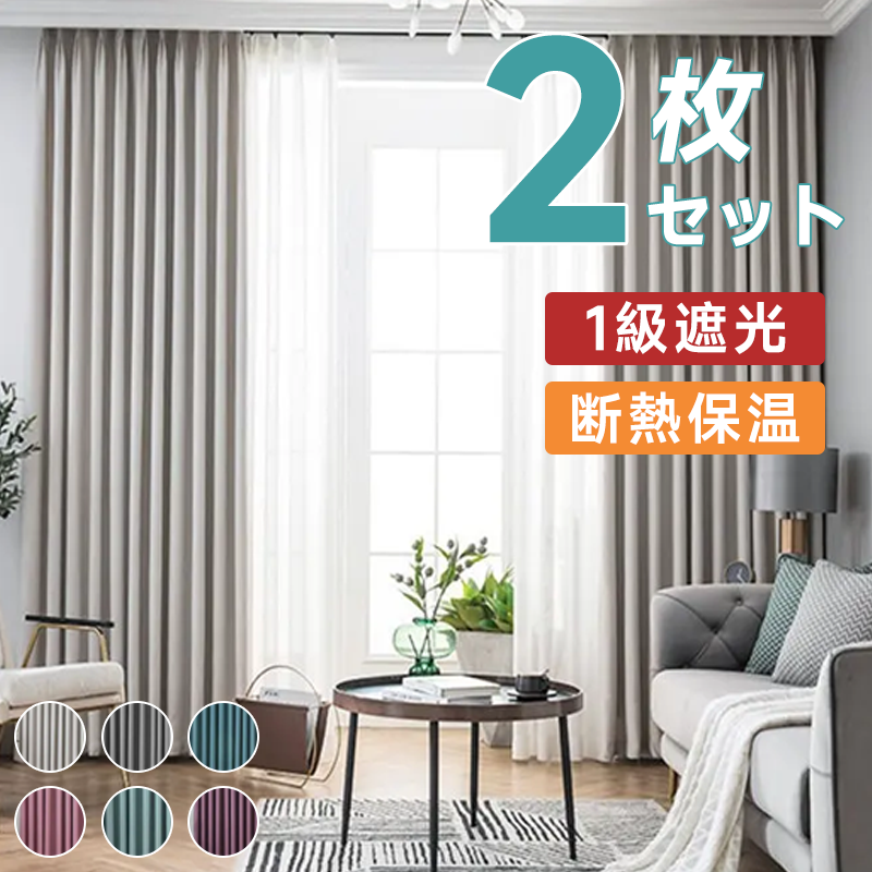 【2枚組】定番の6色 無地 遮光カーテンセット 1級遮光 おしゃれ ドレープ1枚xレース1枚 防寒保温 断熱カーテン 洗える 2倍ヒダ