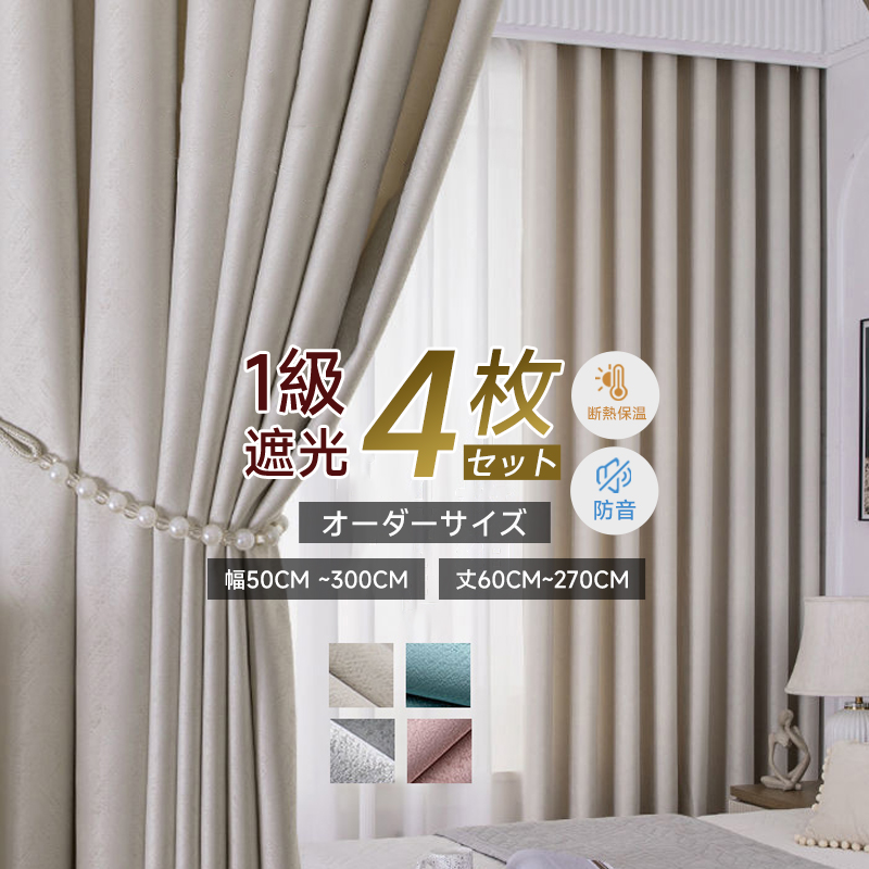【4枚組】おしゃれ 定番 無地 光沢が美しいシンプル 遮光1級 断熱防音 保温効果 セットカーテン 2倍ヒダ