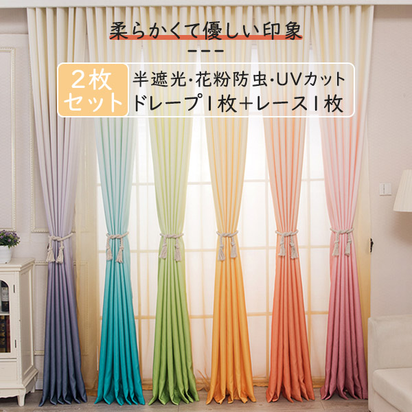 【2枚組】人気 定番な7色 無地 遮光カーテン 遮熱保温 防汚 UVカット おしゃれ ドレープ1枚&レース1枚 カーテンセット 2倍ヒダ