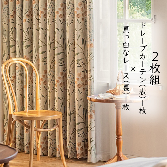【2枚組】 ボタニカル柄 おしゃれ モダン シンプル 遮光 ドレープ1枚&レース1枚 セットカーテン 防寒 防音 遮熱 2倍ヒダ