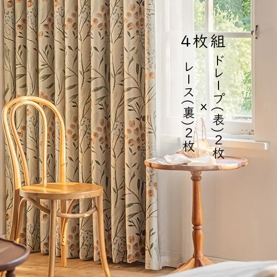 【4枚組】シンプルドレープ2枚+レース2枚 プリント 保温カーテン 良い垂れ感 おしゃれ度高め 防音 遮光カーテン2倍ヒダ