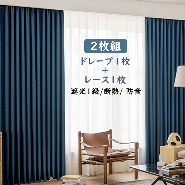 【2枚組】ドレープ1枚&レース1枚 人気商品 垂れ感 おしゃれ シンプル 防音 綿麻 1級遮光 断熱 カーテン2倍ヒダ