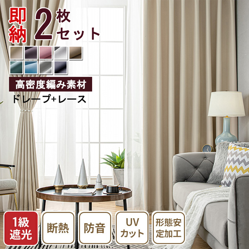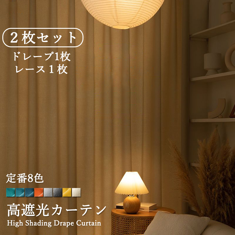 【2枚組】遮光 カーテン 全9色 おしゃれ 1級遮光 UVカット 断熱保温 シンプル 無地 高級感 ドレープ+レース セットカーテン 2倍ヒダ