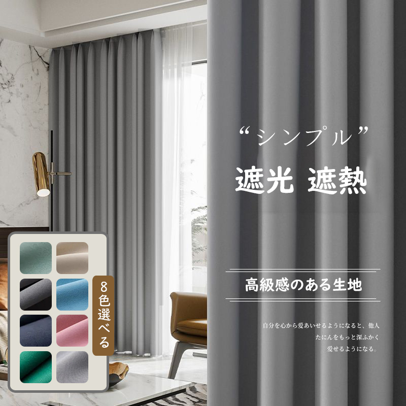 遮光カーテン 安い おしゃれ 1級遮光 シンプル 無地 全8色 UVカット 断熱保温 防音 防犯対策 ドレープカーテン 2倍ヒダ