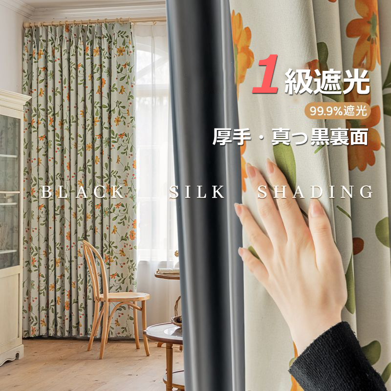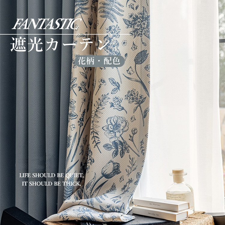 遮光カーテン プリント おしゃれ 花柄 1級遮光 断熱保温 防音 UVカット 厚地 ドレープカーテン 2倍ヒダ