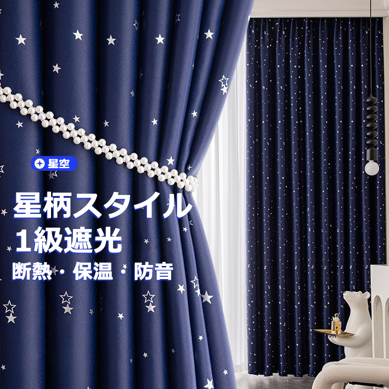 星柄 遮光カーテン 安い おしゃれ 1級遮光 断熱保温 防音 プリント ドレープカーテン 2倍ヒダ