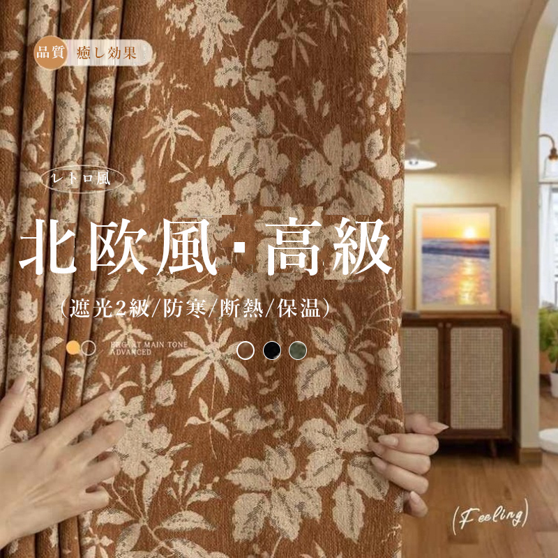 レトロ風 フランス風 癒し効果 立体感 花柄 葉柄 ジャカード加工 1級遮光 防音遮音 断熱防寒 節電対策 優れた垂れ感 ドレープカーテン 2倍ヒダ