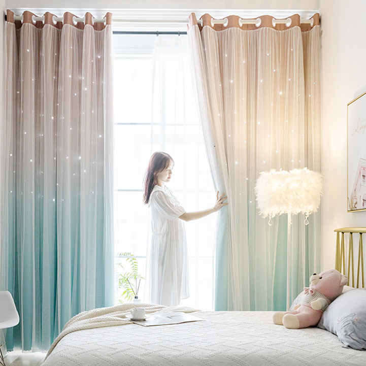姫系 二重デザイン ドレープ&レース 透かし彫り 星柄 オーダーカーテン グラデーション 遮光 断熱 防寒 保温 省エネ 節電 一体型カーテン 2倍ヒダ