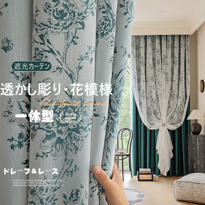 高級感 二重デザイン 一体型カーテン ドレープとレース 遮光2級 防寒断熱 保温 節電 可愛い 立体感 花柄 刺繍入り 遮光カーテン 2倍ヒダ