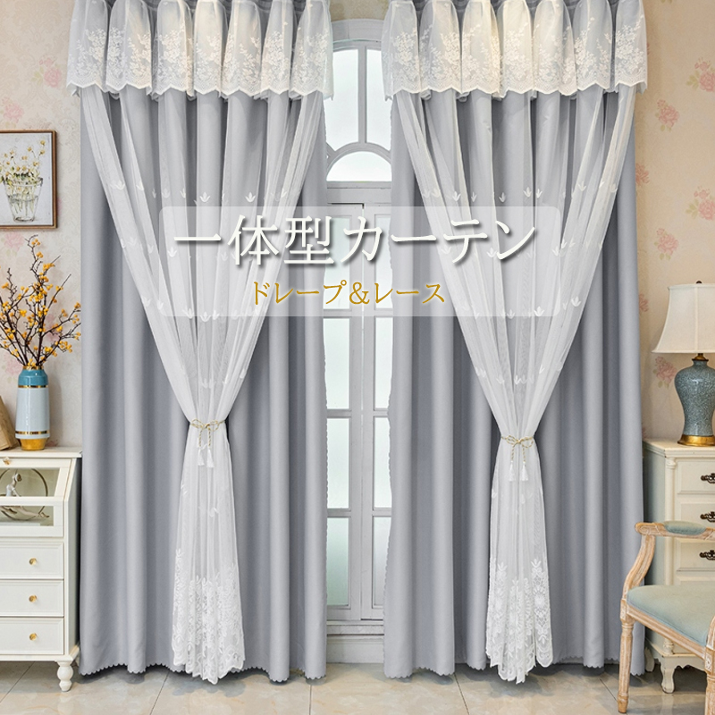 1級遮光 かわいい レース付 防寒 冷気遮断 おしゃれ UVカット 節電対策 2重デザイン 姫系カーテン ドレープ&レース 一体型カーテン 2倍ヒダ