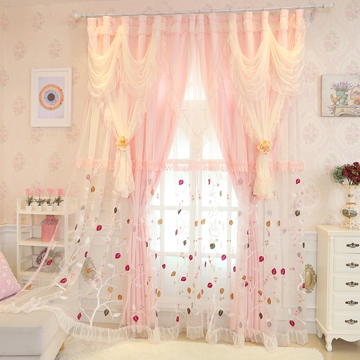 遮光2級 カラフルなリーフデザイン 3色 ドレープとレース 二重 一体型カーテン 2倍ヒダ