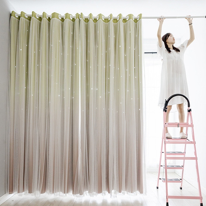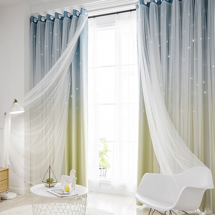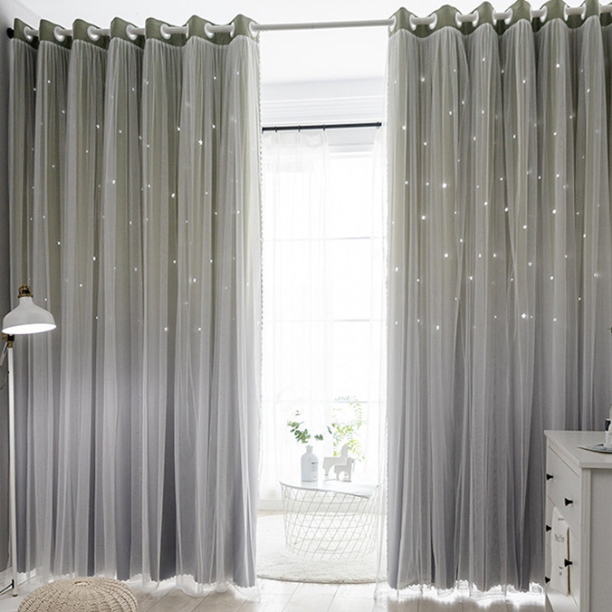 姫系 二重デザイン ドレープ&レース 透かし彫り 星柄 オーダーカーテン グラデーション 遮光 断熱 防寒 保温 省エネ 節電 一体型カーテン 2倍ヒダ
