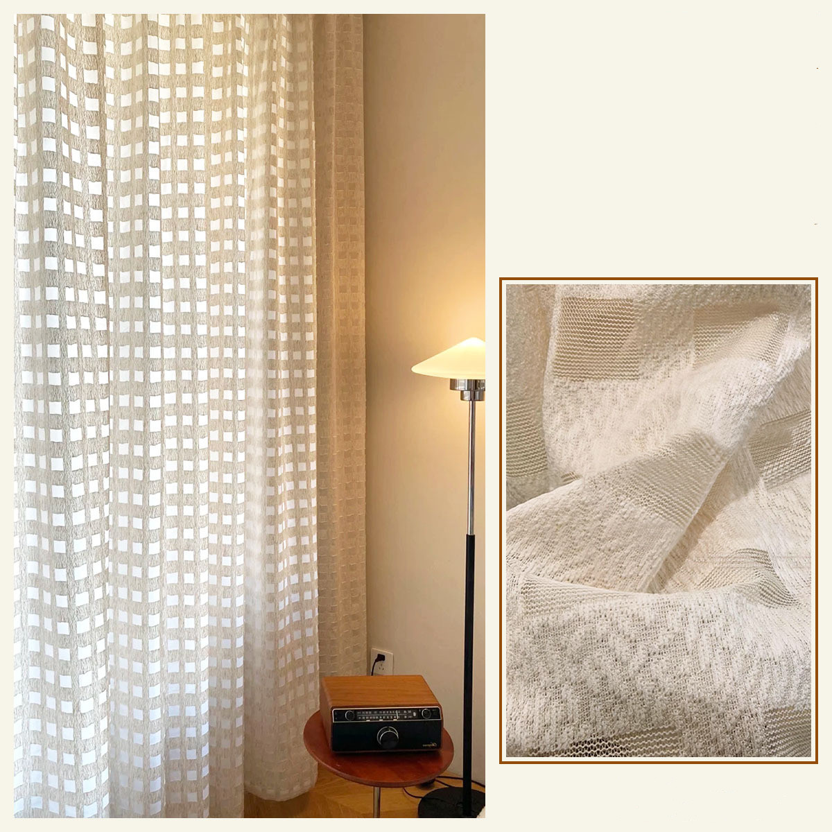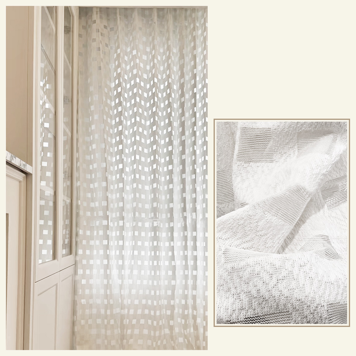 フランス風 優しい雰囲気 癒し効果 高機能レース チェック柄 透かし彫り 部屋が明るく 圧迫感なし 遮像 花粉防虫 外から見えない UVカット 採光 オーダー プライバシー保護 レースカーテン 2倍ヒダ