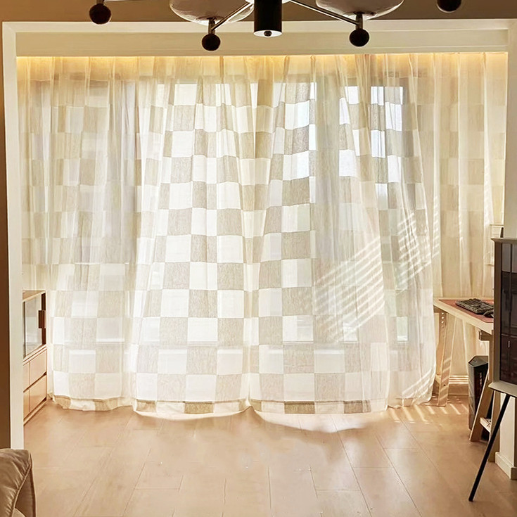 圧迫感なし チェック柄 優雅 優しい雰囲気 昼夜目隠し 防塵 採光 UVカット 遮像 プライバシー保護 破れにくい 日焼け防止 1cm単位 オーダー レースカーテン 2倍ヒダ