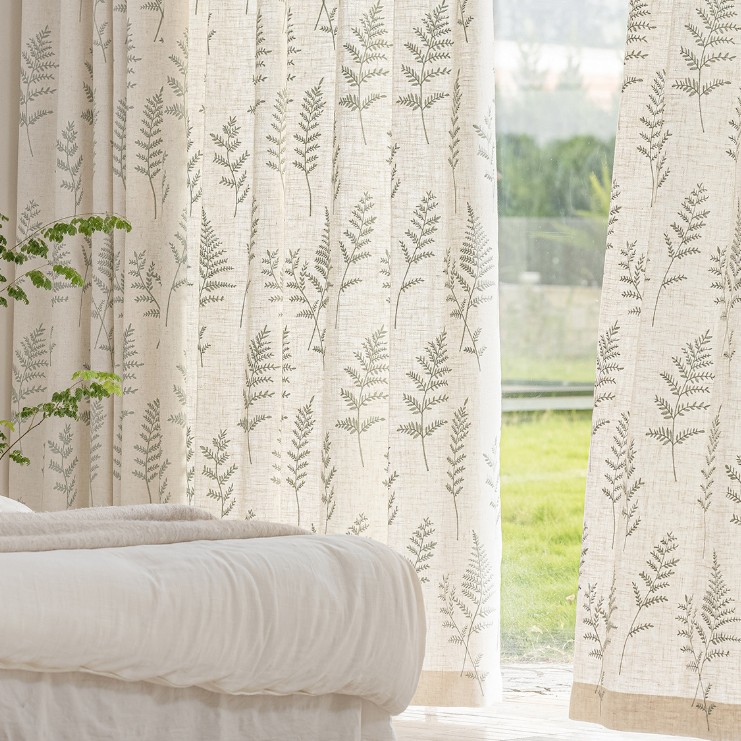 リネンカーテン 天然素材 優雅 刺繍入り ナチュラル感 光を和らげる 部屋が明るく 垂れ感 癒し効果 昼夜目隠し UVカット 遮像 プライバシー保護 破れにくい 日焼け防止 採光 オーダー レースカーテン 2倍ヒダ