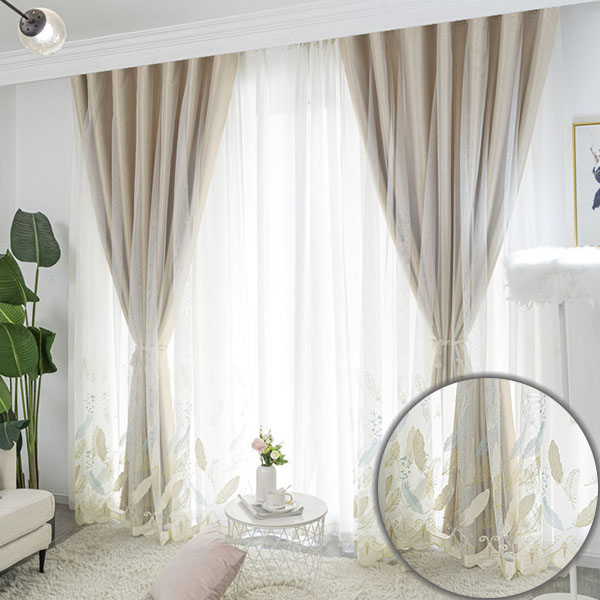 高級感 ジャガード織り 羽根刺繍 北欧 防寒 遮音 1級遮光 おしゃれ 厚手 一体型カーテン 2倍ヒダ