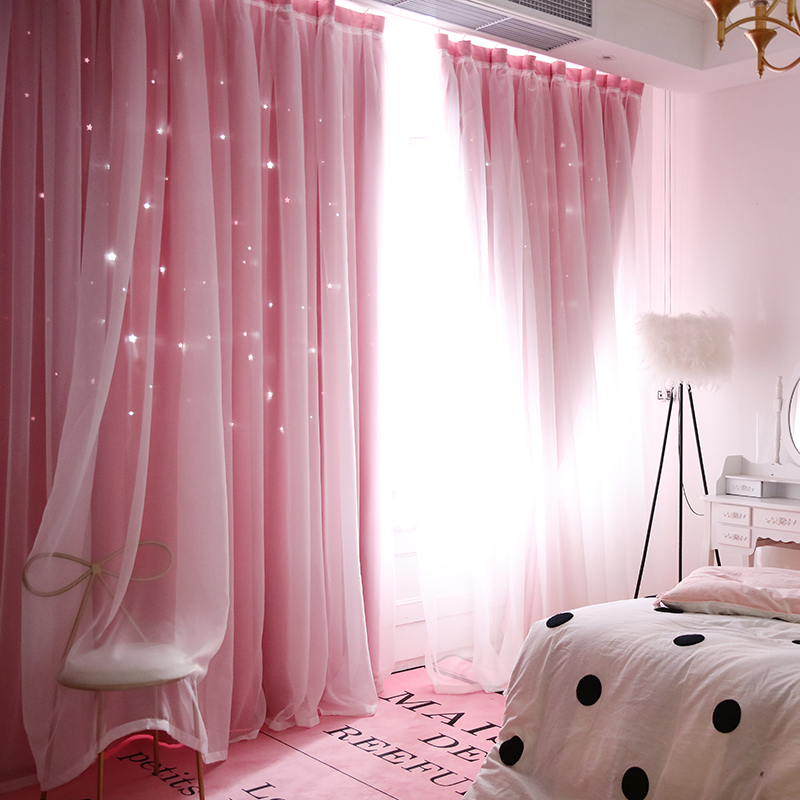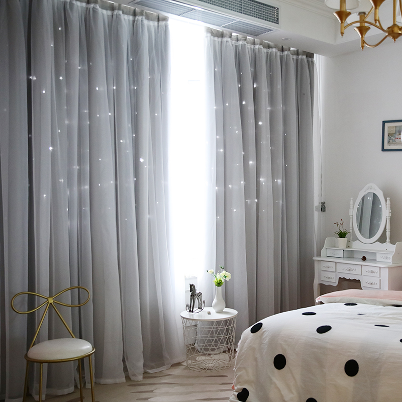 おしゃれ 可愛い星柄の透かし彫りデザイン 大人気姫系 二重 遮光 ドレープ+レース 一体型カーテン 2倍ヒダ