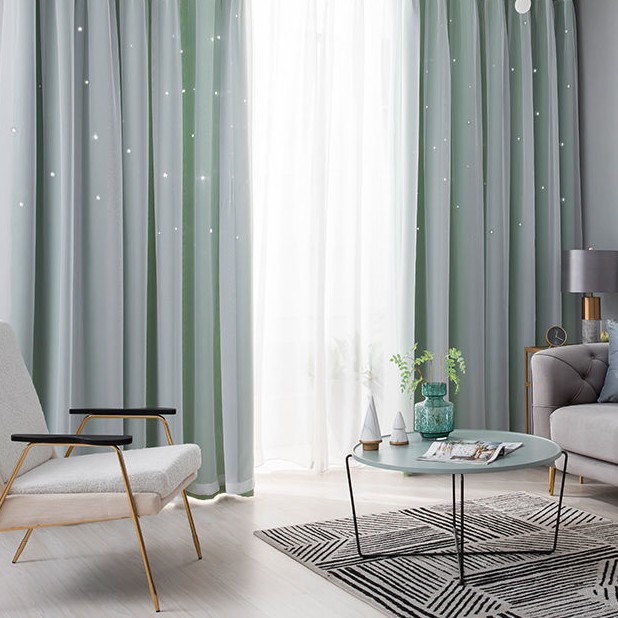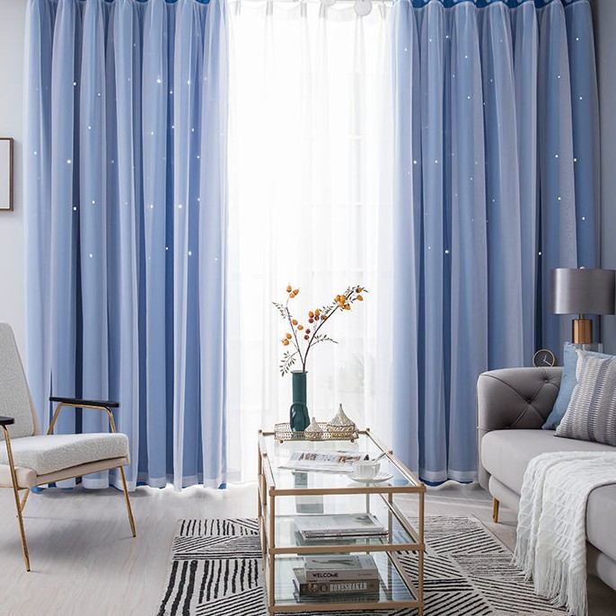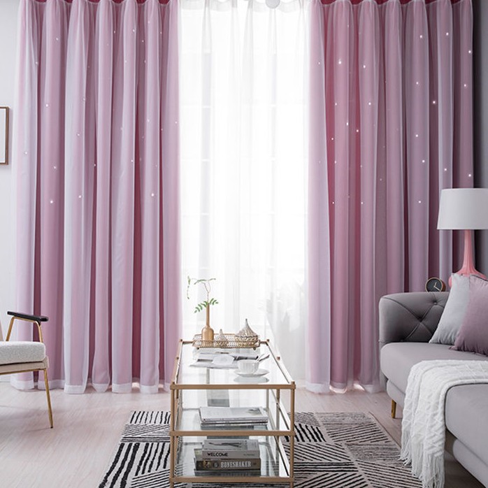 5色選択 可愛いデザイン 姫系 おしゃれ 星の透かし彫り キラキラ 子供部屋 女性部屋 遮光3級 遮熱保温 ドレープ+レース 一体型カーテン 2倍ヒダ