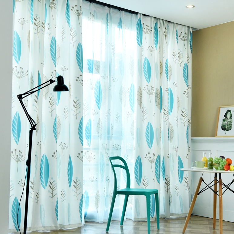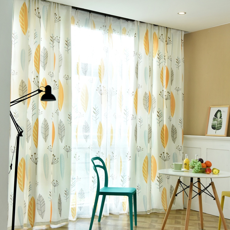【2枚組】北欧風 リーフ柄デザイン プリント 半遮光 花粉防虫 遮像 UVカット ドレープ+レース セットカーテン 2倍ヒダ