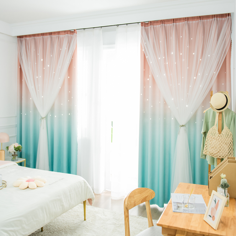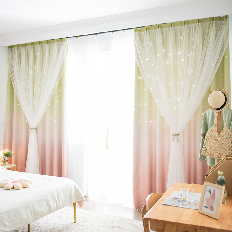 2重デザイン プリンセス 北欧風 おしゃれ グラデーション×星デザイン 遮光遮熱 保温防音カーテン 素材感 一体型カーテン 2倍ヒダ