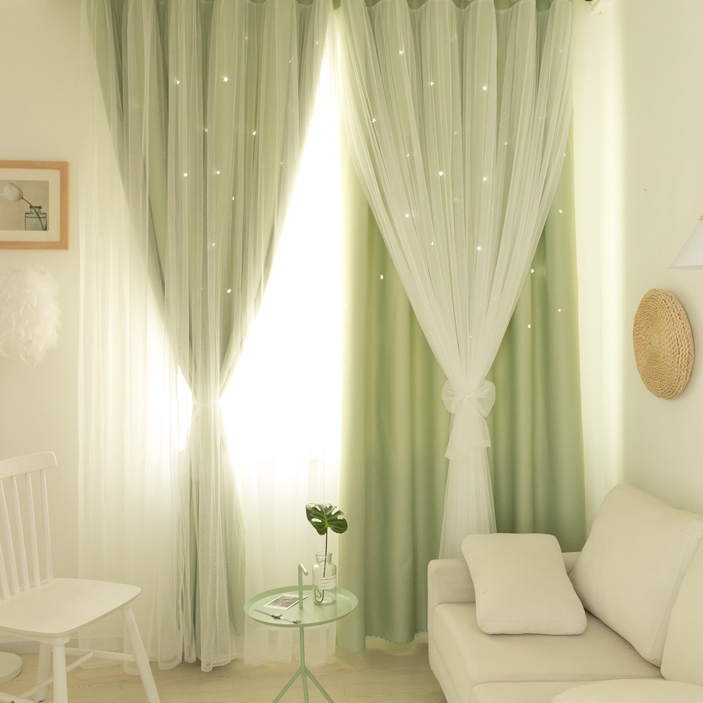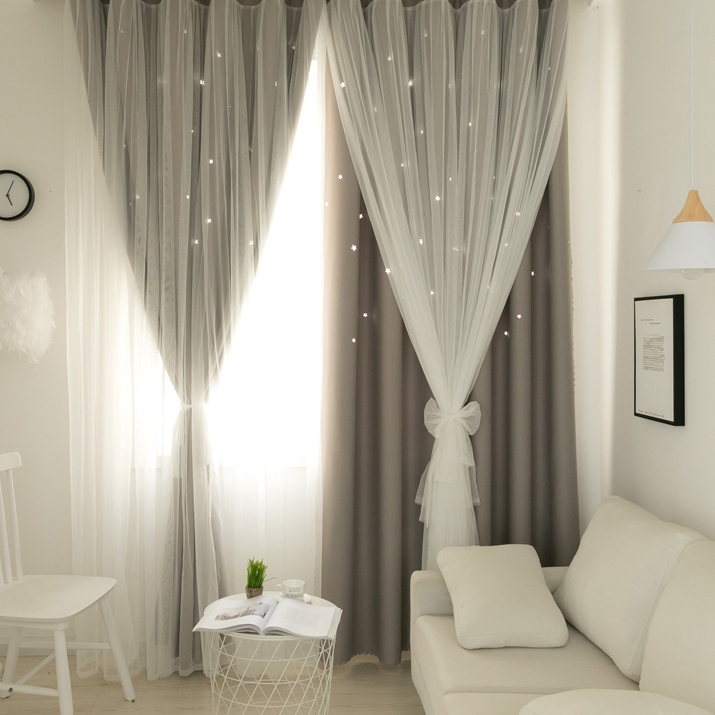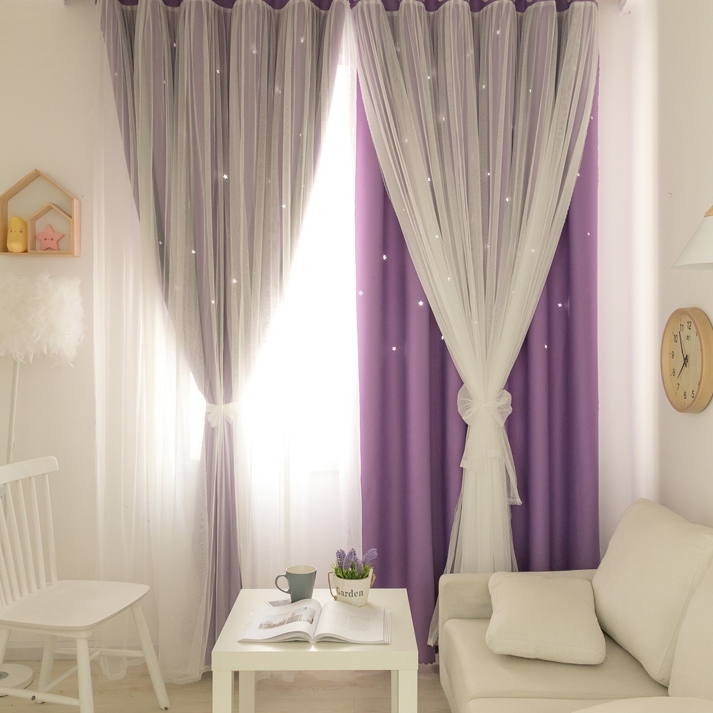 1級遮光 遮熱保温 おしゃれな6色 2重カーテン 姫系 透かし彫り 星柄 北欧風 一体型カーテン 2倍ヒダ