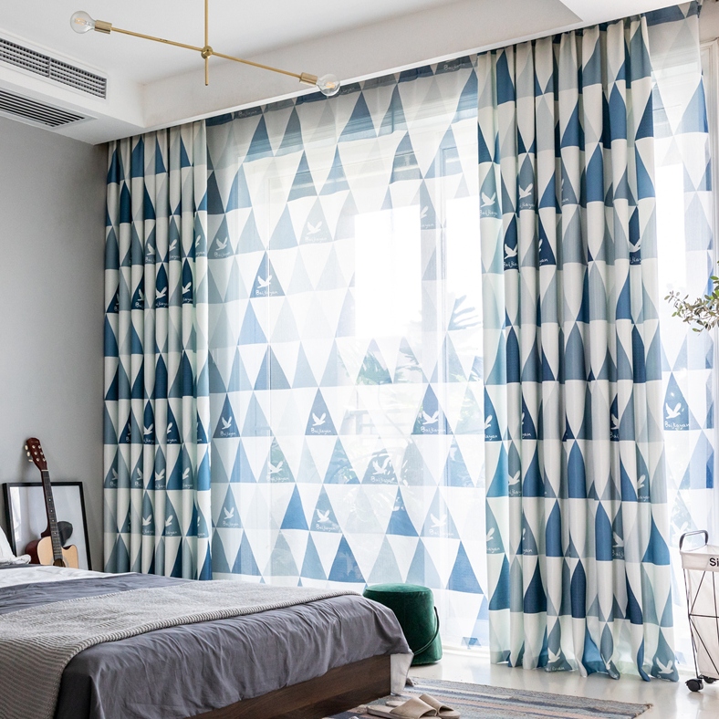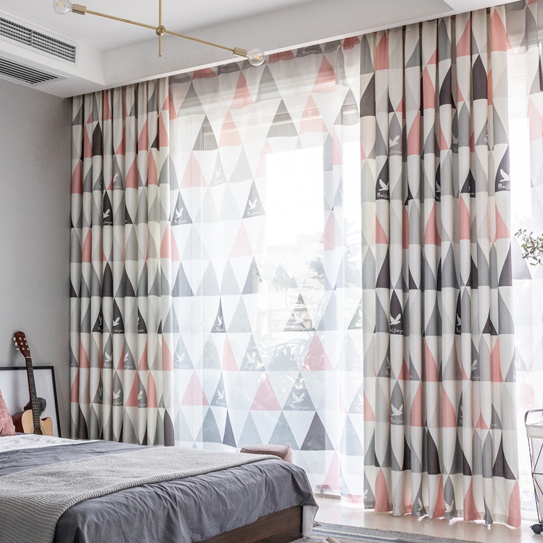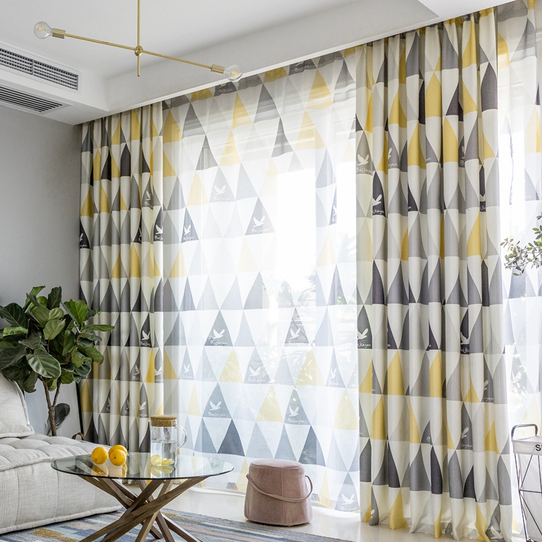 【2枚組】【セット】北欧風 幾何学柄デザイン ドレープ1枚&レース1枚 遮光 カーテン 2倍ヒダ