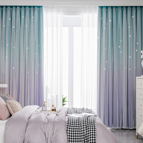 【一体型】おしゃれ グラデーション色 お姫系 透かし彫り星 遮光遮熱 防音カーテン 2倍ヒダ