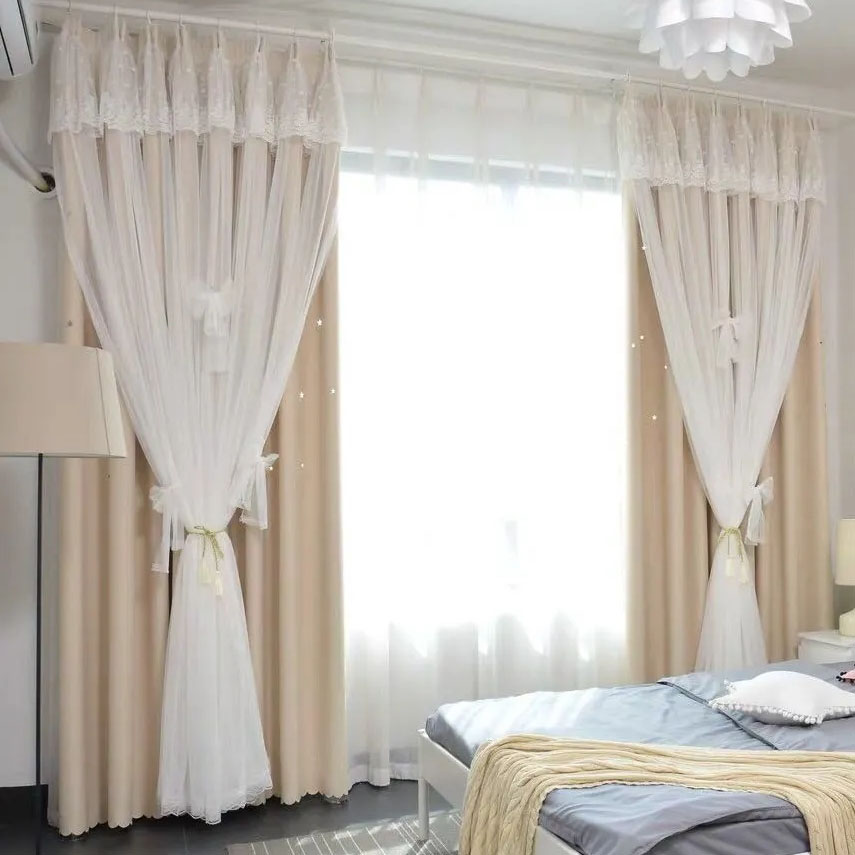 おしゃれ 姫系 可愛いデザイン リボン付き 遮光 遮熱 遮音 一体型カーテン2倍ヒダ