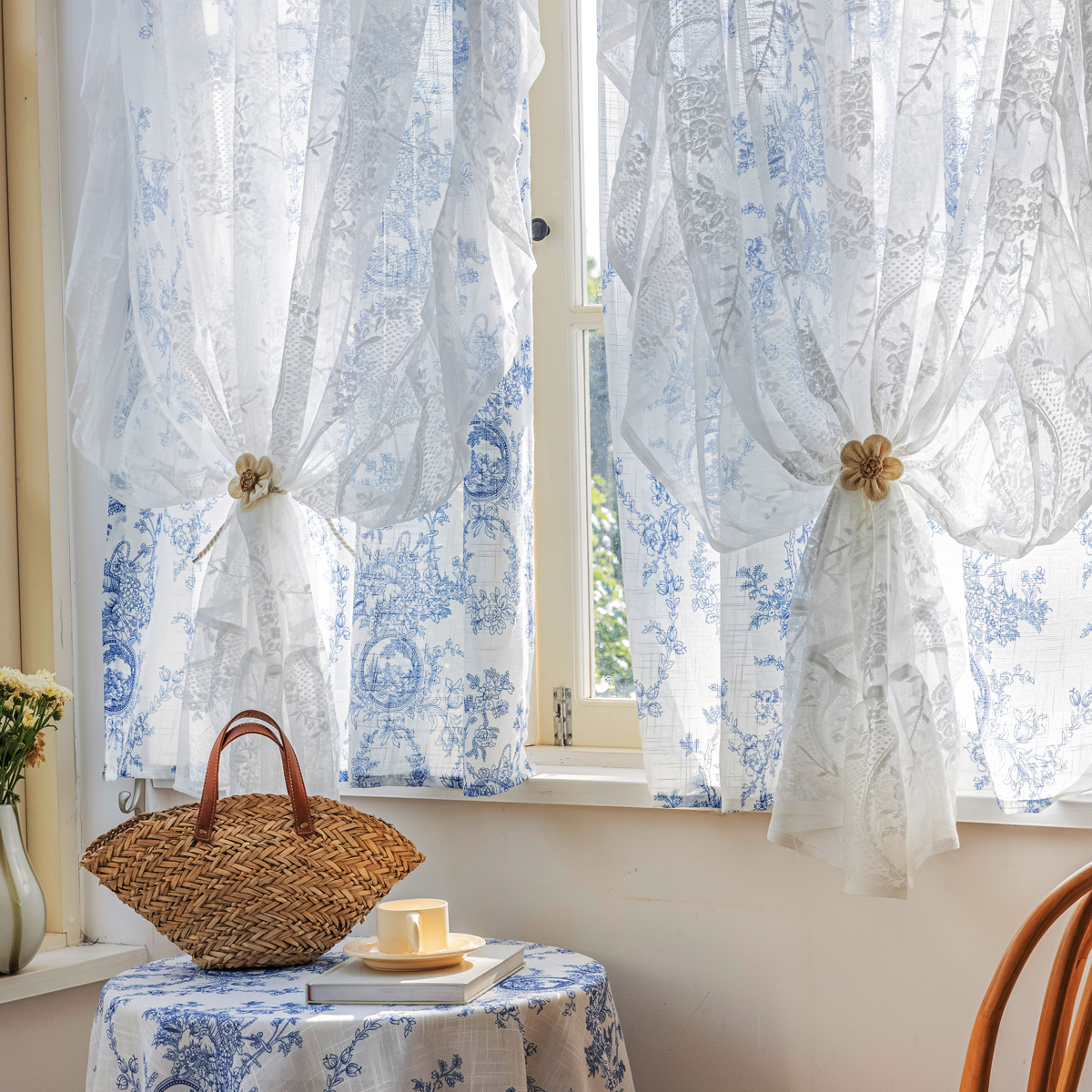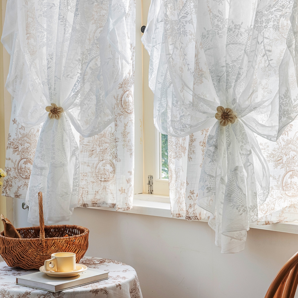 2重レースデザイン おしゃれ フランス風 クラシックスタイル UVカット 遮像レース 一体型カーテン 2倍ヒダ
