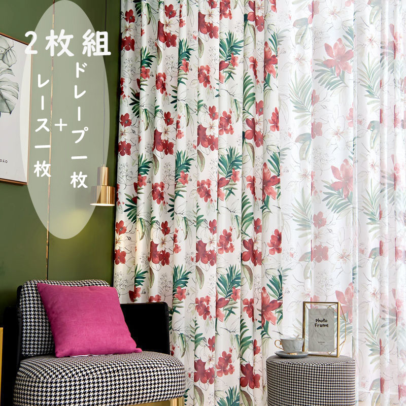 【2枚組】 おしゃれな花柄 アメリカ田園風 ドレープ1枚&レース1枚 人気商品 シンプル カーテン 断熱保温 カーテン 2倍ヒダ