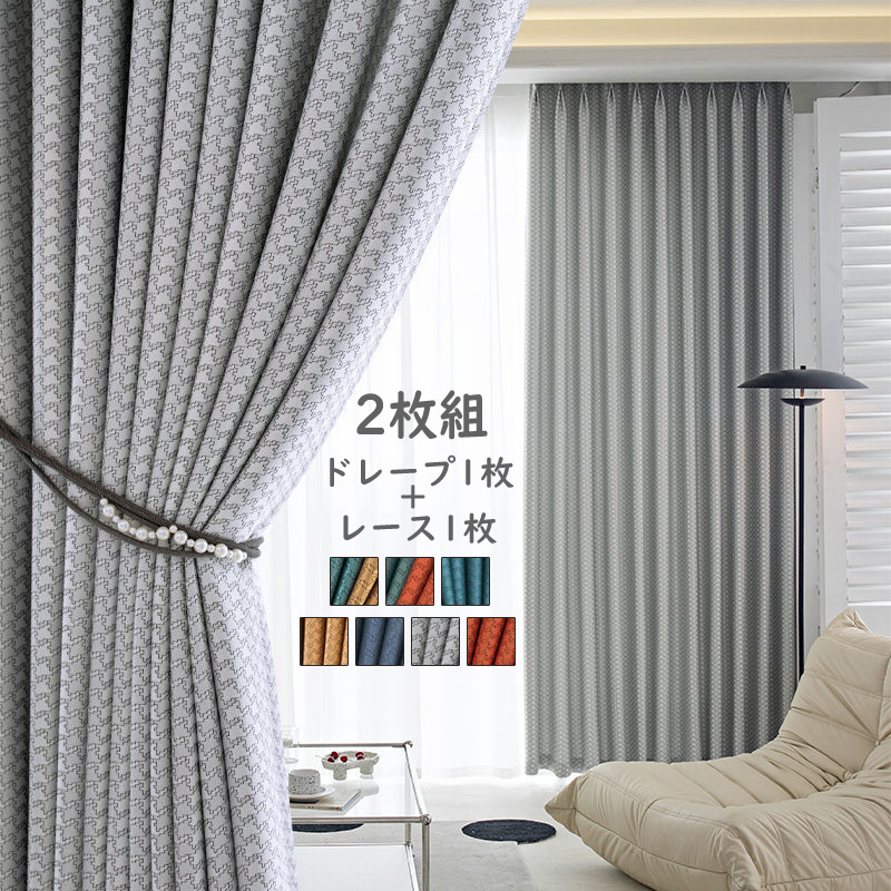 【2枚組】北欧テイスト 遮光カーテンセット 高級感があるジャガード織り 無地 ツートーン 1級遮光 遮熱 保温 防音 ドレープ1枚xレース1枚 2倍ヒダ
