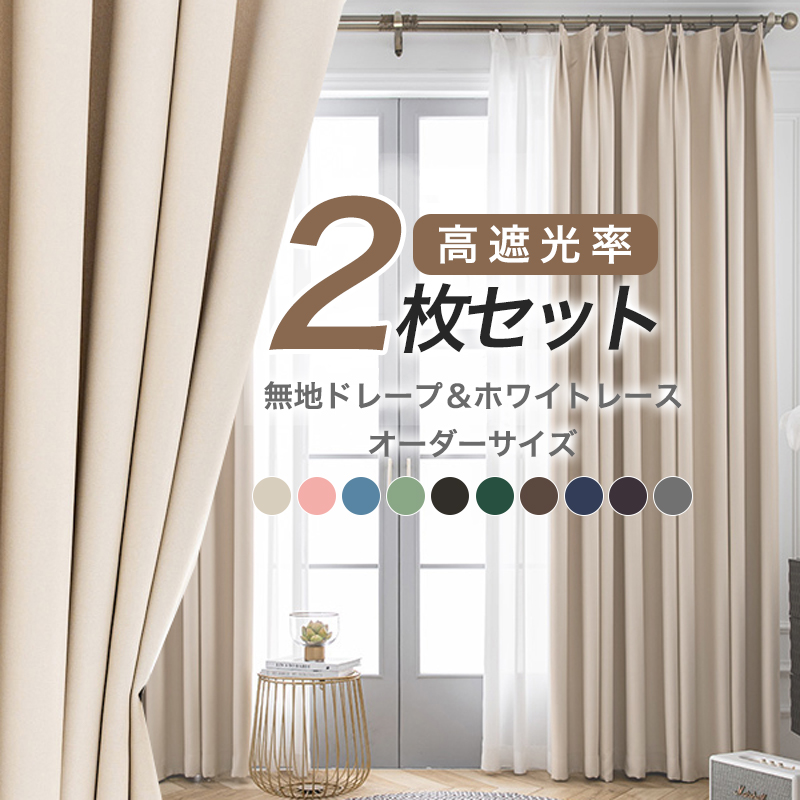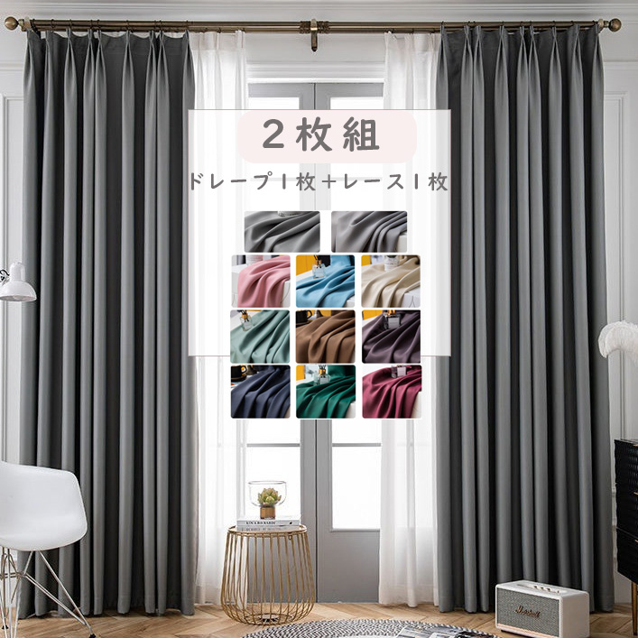 【2枚組】セット 11色 お手頃価格 高遮光率 無地ドレープ&白レース おしゃれ 遮光1級 断熱 カーテン 2倍ヒダ