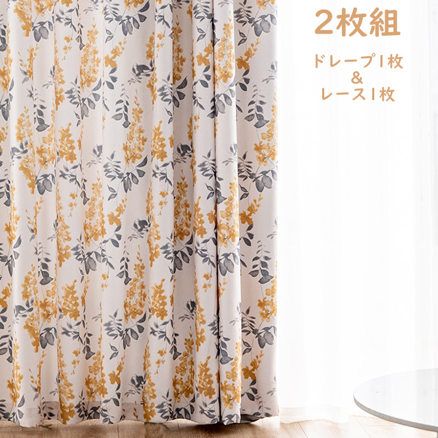 【2枚組】 田園風 洗濯OK 遮光カーテン 田園風 高級感がある生地遮光2級 ドレープ1枚&レース1枚 カーテンセット 2倍ヒダ
