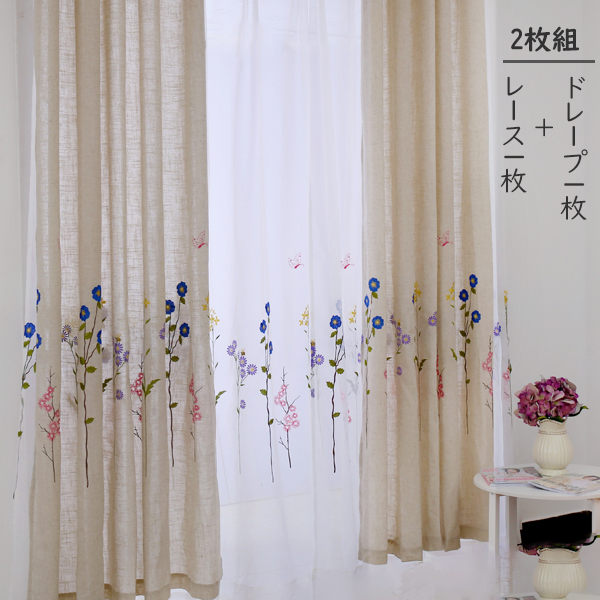 【2枚組】綿麻 リネン お花柄 刺繡 遮光2級 和室 田園調 おしゃれ カーテン おすすめ カーテン セット ドレープ1枚+レース1枚 カーテンセット 2倍ヒダ