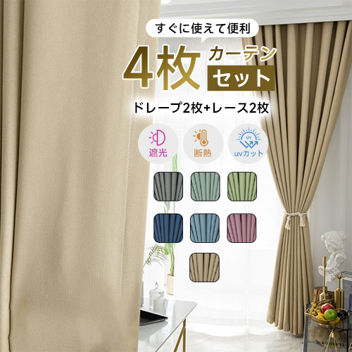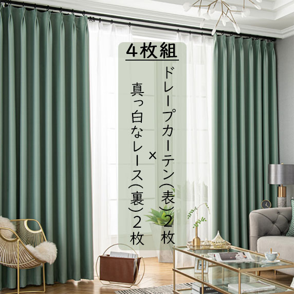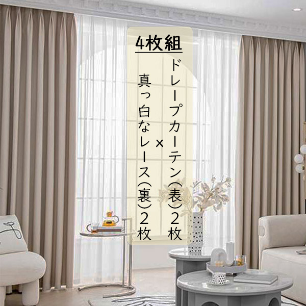 【4枚組】おしゃれ カーテン 防寒 防音 遮熱 無地 遮光カーテンセット ドレープ2枚&レース2枚 シンプル セット 2倍ヒダ