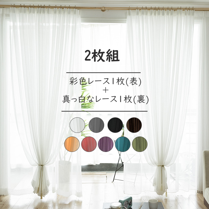 【2枚組】 全9色 彩色 レース & 真っ白 レース カーテン セット 無地 シンプル 定番 人気 目隠し レース カーテン2倍ヒダ