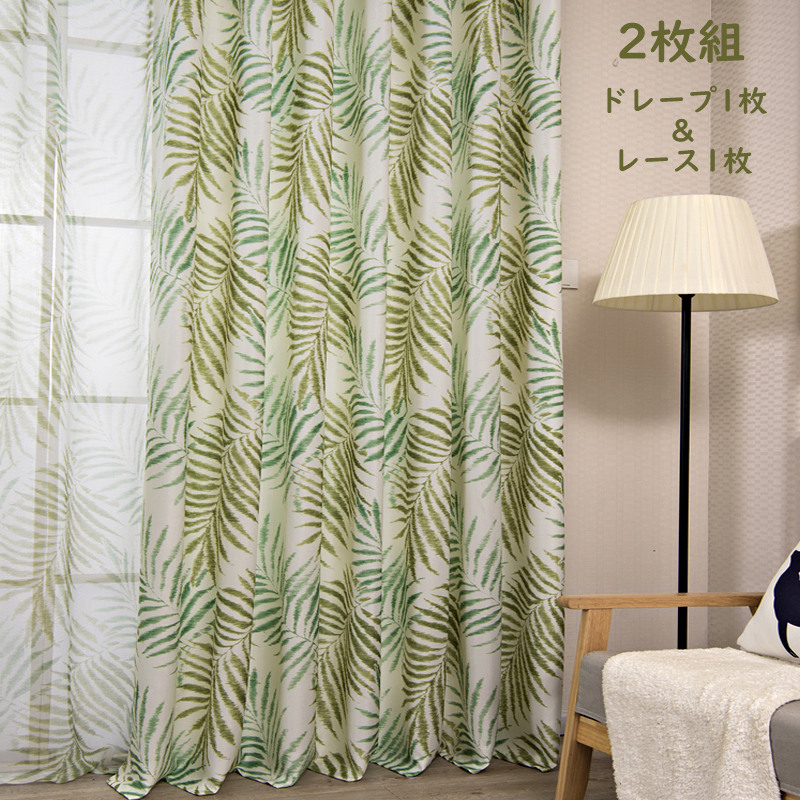 【2枚組】おしゃれなボタニカル柄 遮像 透けにくい プライバシー保護 ナチュラル カーテンセット リネン1枚&レース1枚 花粉防虫 2倍ヒダ