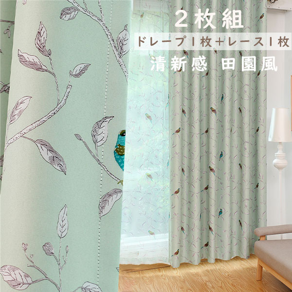 【2枚組】グリーン色 清新感 綺麗なリーフに小鳥が潜む癒しデザイン 遮光1級 ドレープ1枚+レース1枚 セットカーテン 2倍ヒダ