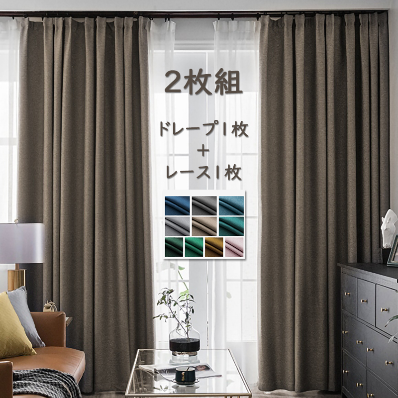 【2枚組】おしゃれ 全10色 遮光カーテン 綿麻 断熱保温 無地 厚地 シンプル リビングルーム 高機能 遮光1級 ドレープ+レース セットカーテン 2倍ヒダ
