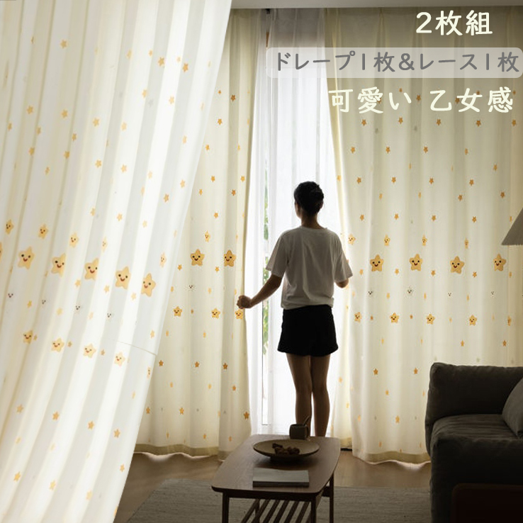 【2枚組】おしゃれ 星柄 可愛い カートゥーン 乙女感 遮光2級 花粉防虫 遮熱 通年適用 子ども部屋にピッタリ 透けない 安眠 セットカーテン 2倍ヒダ
