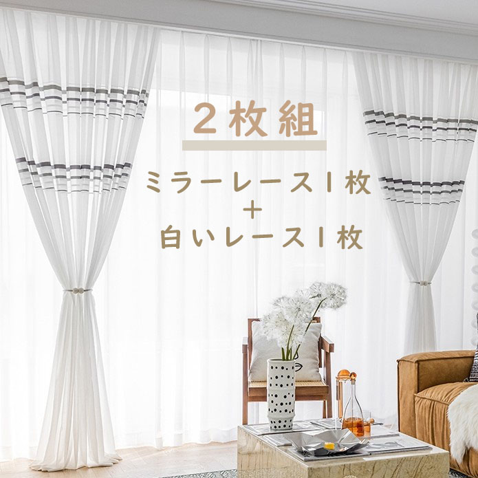 【2枚組】おしゃれ 北欧 モダン ボーダー ミラーレース1枚+白いレース1枚 遮像 プライバシー保護 良い垂れ感 シンプル UVカット 2倍ヒダ